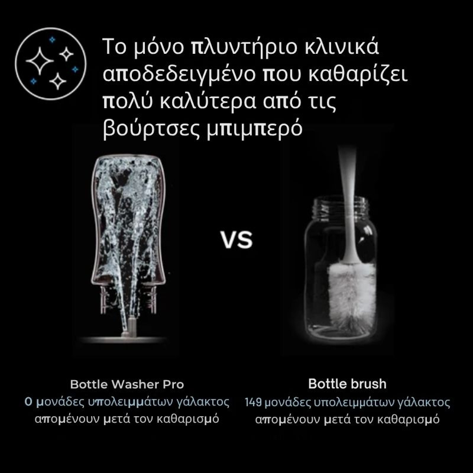 Πλένει, αποστειρώνει και στεγνώνει αυτόματα μπιμπερό, μέρη θηλάστρου και αξεσουάρ. Κλινικά αποδεδειγμένο ότι καθαρίζει καλύτερα από μια βούρτσα για μπιμπερό. Βάζουμε τέλος στο πλύσιμο στο χέρι, εξοικονομώντας χρόνο και κόπο!