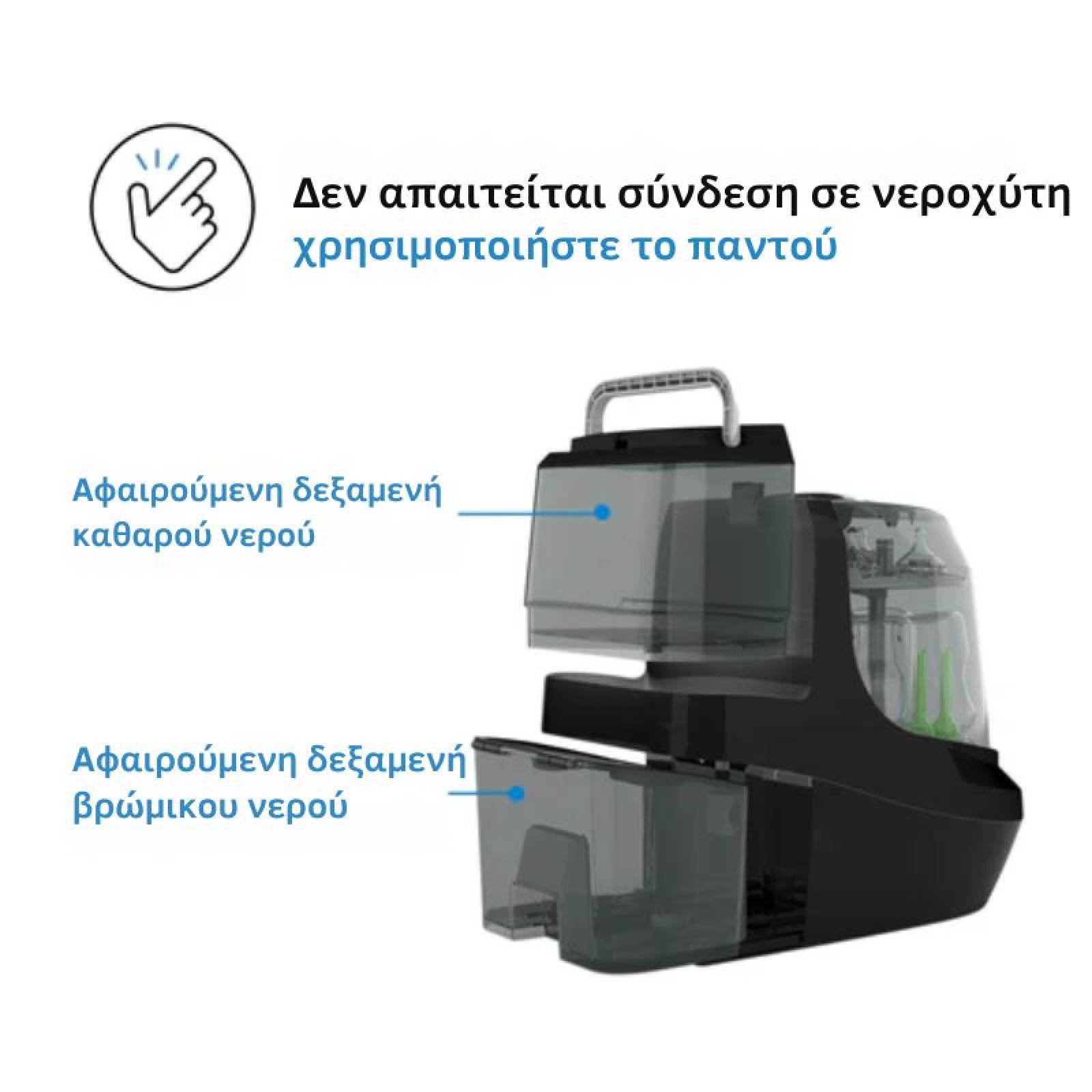 • Δεν απαιτείται σύνδεση σε νεροχύτη, λειτουργεί χωρίς ακατάστατους σωλήνες αποστράγγισης και είναι εύκολο στη χρήση. Περιλαμβάνει αφαιρούμενες δεξαμενές καθαρού και βρώμικου νερού ώστε να μπορείτε να το χρησιμοποιείτε οπουδήποτε στο σπίτι σας. Διαθέτει ενσωματωμένους τροχούς για εύκολη μετακίνηση και πίνακα ελέγχου LCD. Περιλαμβάνει επίσης αντικαταστάσιμο φίλτρο HEPA