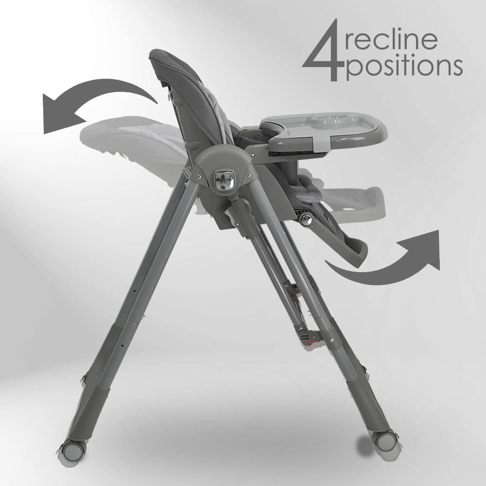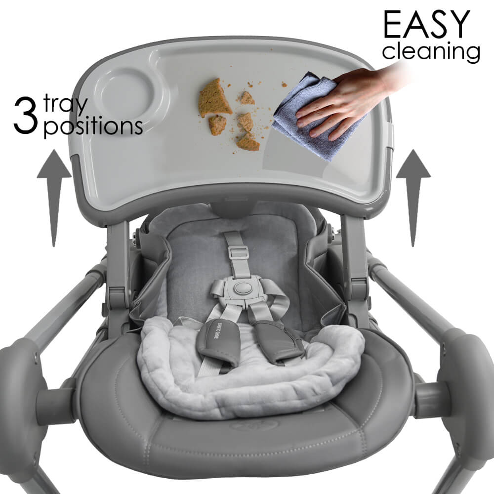 – Ανατομικό κάθισμα με πλάτη που ρυθμίζεται σε 4 θέσεις στη λειτουργία καρέκλας φαγητού και σε 3 θέσεις στη λειτουργία κούνιας.