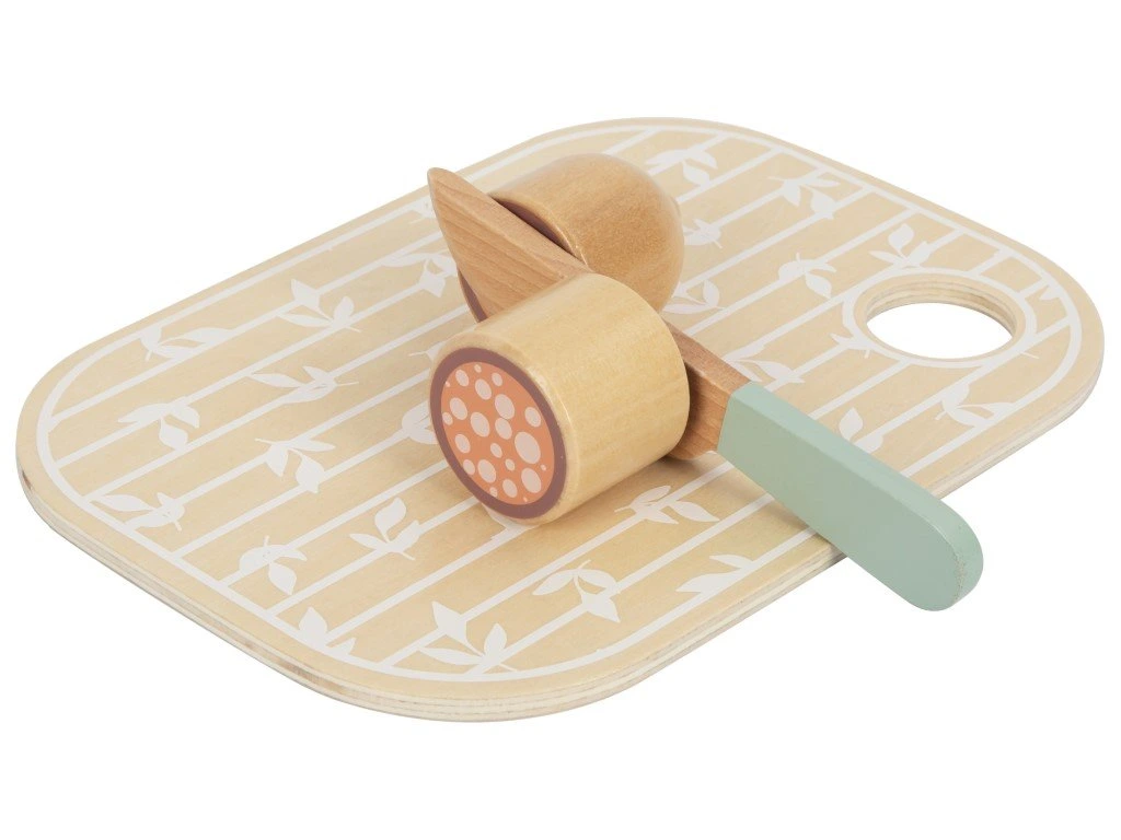Το σετ διαθέτει ξύλινη επιφάνεια κοπής (που λειτουργεί και ως καπάκι του κουτιού) και ξύλινο μαχαίρι.