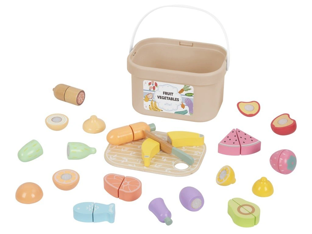 Το EliNeli Montessori Κουτί παιχνιδιών κοπής φρούτων 3 σε 1 σε πρακτικό και εύκολα μεταφερόμενο κουτί επιτρέπει στα παιδιά να ετοιμάσουν «γιορτινό τραπέζι» στο σπίτι ή σε επίσκεψη.Τα φρούτα, τα λαχανικά και τα υπόλοιπα τρόφιμα χωρίζονται σε δύο μέρη και ενώνονται ξανά με αυτοκόλλητο velcro. Με το ξύλινο μαχαίρι μπορούν να τα κόψουν με ασφαλή, παιδικό τρόπο, αναπτύσσοντας παράλληλα δεξιότητες και φαντασία.
