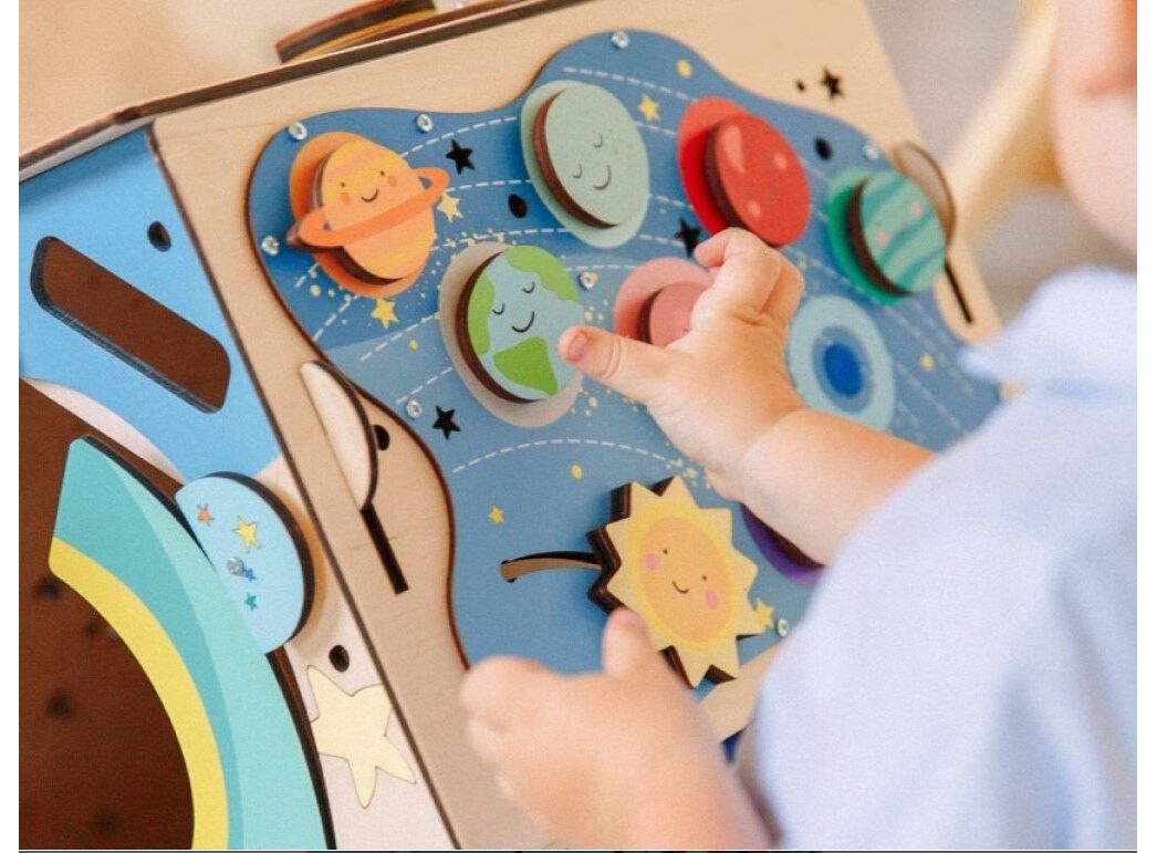Κάθε πλευρά του πίνακα δραστηριοτήτων είναι πρωτότυπη, με πρωτότυπα στοιχεία, με θέμα το διάστημα. Μαζί με τον κοσμοναύτη, πήγε στο διάστημα και ένα ρομπότ, το οποίο έχει ετοιμάσει πολλά ενδιαφέροντα στοιχεία για το παιδί σας. Αφού ανοίξουν την κοιλιά του ρομπότ, τα παιδιά θα βρουν μια θέση πίσω από την πόρτα για να αποθηκεύσουν νομίσματα, τα οποία θα χρησιμοποιήσουν στο διασκεδαστικό καρουζέλ. Απλώς ρίξτε ένα νόμισμα στο στόμιο του καρουζέλ και περιστρέψτε το αστέρι μέχρι τα νομίσματα να πέσουν έξω από το καρουσέλ. Οι πλανήτες και τα αστέρια στο σύμπαν είναι αλληλένδετα γρανάζια που μπορούν να τεθούν σε κίνηση περιστρέφοντας μόνο ένα από αυτά.