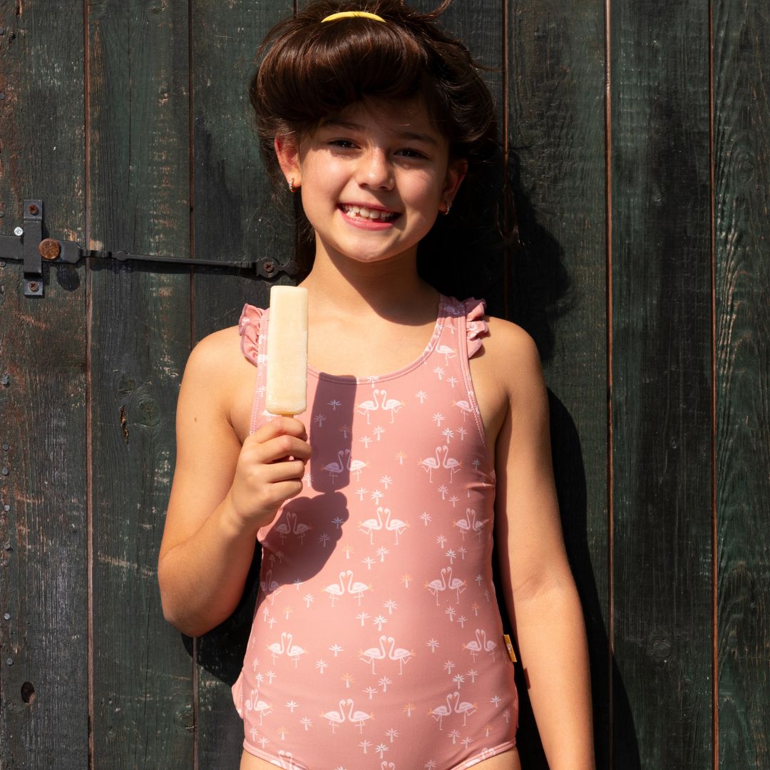Τα γλυκά βολάν στις τιράντες και τους γοφούς, καθώς και το υπέροχο σχέδιο, κάνουν το μαγιό να … τραβάει τα βλέμματα! Σε συνδυασμό με την εμφάνιση, το μαγιό προσφέρει UV50 και προστατεύει το παιδί από τον ήλιο.