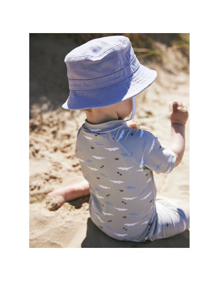 Αυτό το υφασμάτινο παιδικό καπέλο τύπου bucket καλύπτει το μεγαλύτερο μέρος του κεφαλιού ενώ διαθέτει περιμετρικό γείσο. Παρέχει προστασία από τη βλαβερή ηλιακή ακτινοβολία (UVA-UVB), φροντίζοντας αποτελεσματικά το δέρμα του παιδιού σας.