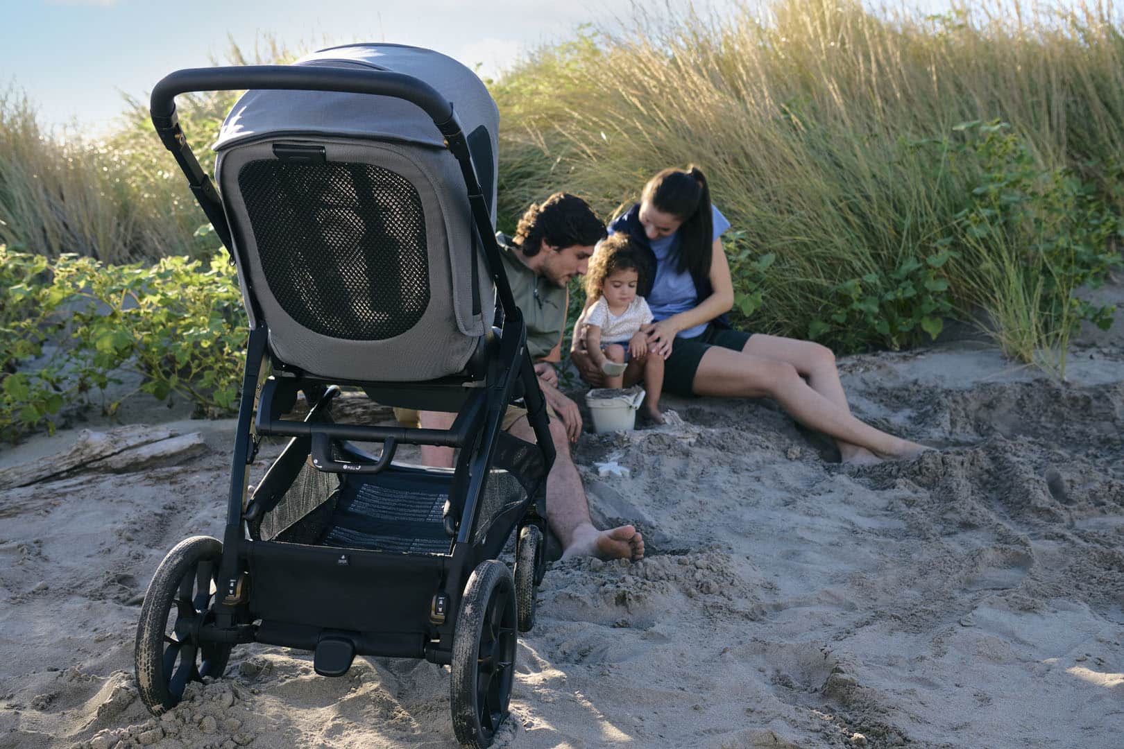 Η κουκούλα προστατεύει από τις ακτίνες UV και το σκιάδιο βοηθά όταν ο ήλιος είναι χαμηλά. Η επεκτεινόμενη κουκούλα εγγυάται τη μέγιστη προστασία ακόμη και όταν το παιδί είναι ξαπλωμένο.