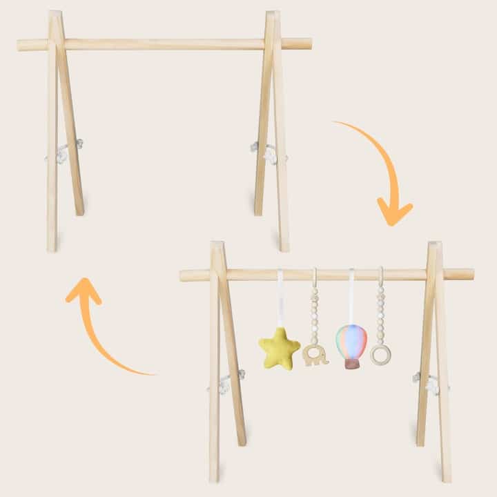 Η κατασκευή από λείο ξύλο οξιάς, χωρίς αιχμηρές άκρες, εγγυάται απόλυτη ασφάλεια και σταθερότητα. Τα κρεμαστά παιχνίδια από φυσικό ξύλο και μαλακά υφάσματα διεγείρουν την αφή και την όραση, ενώ οι διαφορετικές υφές βοηθούν το μωρό να αναπτύξει τις αισθήσεις του και τον συντονισμό χεριού–ματιού. Το μωρό μαθαίνει να απλώνει τα χεράκια του, να πιάνει, να κουνά και να εξερευνά, καλλιεργώντας τη λεπτή κινητικότητα και τις πρώτες ενεργές κινήσεις.