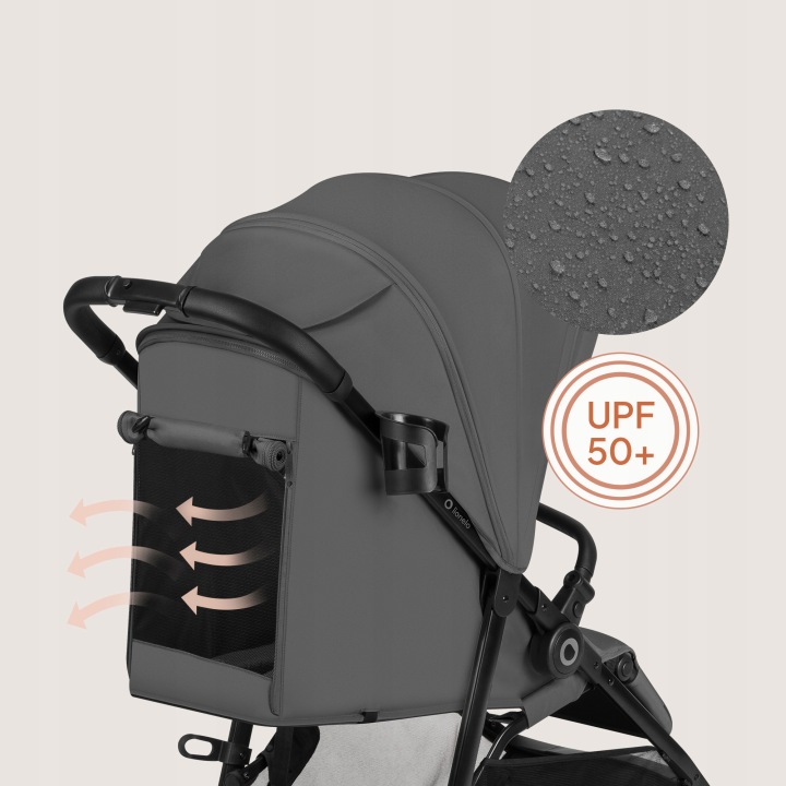 Η κουκούλα XXL με επιπλέον πάνελ δημιουργεί έναν ασφαλή και προστατευμένο χώρο για το μωρό. Το φίλτρο UPF50+ μπλοκάρει την επιβλαβή ηλιακή ακτινοβολία, ενώ η υδροφοβική επίστρωση προστατεύει από την υγρασία. Το διακριτικό παραθυράκι με μαγνητικό κλείσιμο σας επιτρέπει να ελέγχετε το παιδί χωρίς να διαταράσσετε τον ύπνο του.