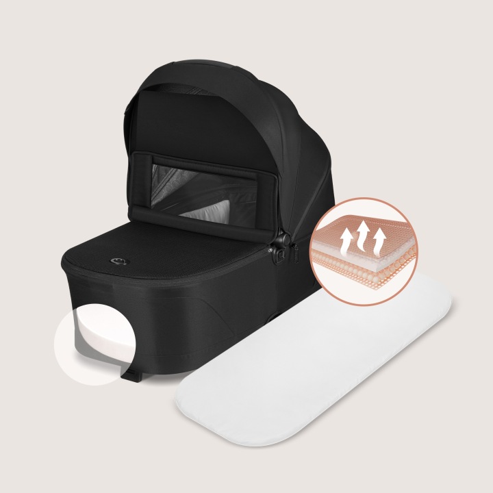 Στο πορτ μπεμπέ έχει τοποθετηθεί στρώμα AiryDots με ειδικά κανάλια αερισμού, τα οποία ενισχύουν τη ροή του αέρα και βοηθούν στη διατήρηση ενός ευχάριστου κλίματος στο εσωτερικό.