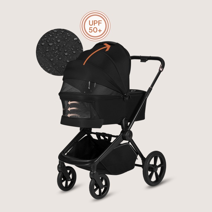 Η κουκούλα του πορτ μπεμπέ και του καθίσματος είναι κατασκευασμένη από αδιάβροχα υλικά με φίλτρο UPF 50+, προσφέροντας αποτελεσματική προστασία στο παιδί τόσο από τον ήλιο όσο και από τη βροχή.