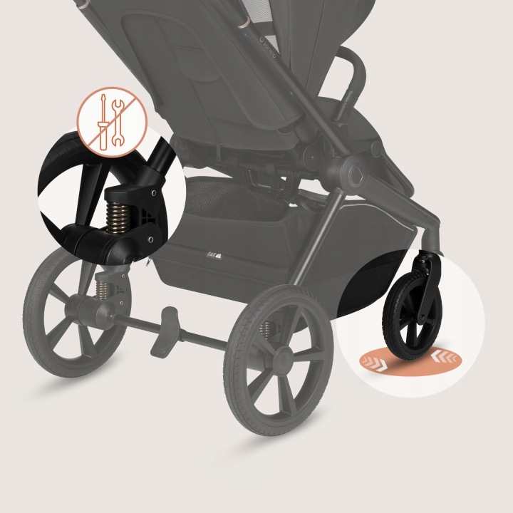 Οι ανθεκτικοί τροχοί PU με περιστροφή 360° και η προηγμένη ανάρτηση εξασφαλίζουν ομαλή κύλιση σε κάθε επιφάνεια. Η ρυθμιζόμενη τηλεσκοπική λαβή διευκολύνει τη χρήση από κάθε γονέα, ενώ το κεντρικό φρένο αυξάνει την ασφάλεια.