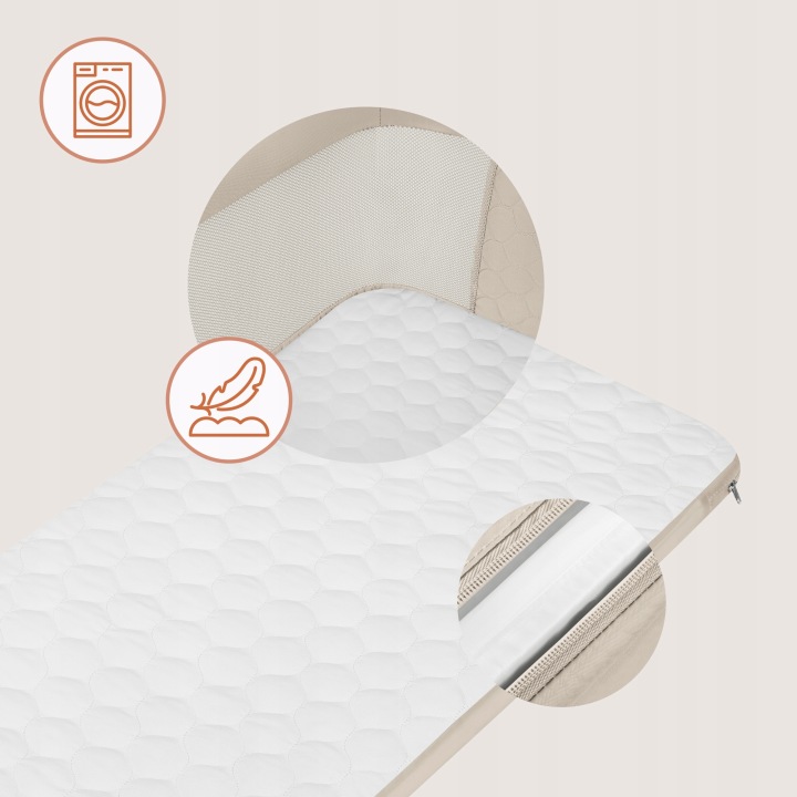 Ο άνετος ύπνος του μωρού εξασφαλίζεται από το στρώμα αφρού T25 πάχους 2 cm, το οποίο διαθέτει μαλακό κάλυμμα Peach Skin για ευχάριστη αίσθηση και σωστή στήριξη. Τα πλαϊνά πάνελ από διαπνέον πλέγμα προσφέρουν καλύτερη κυκλοφορία αέρα και επιτρέπουν στους γονείς να βλέπουν συνεχώς το μωρό τους.