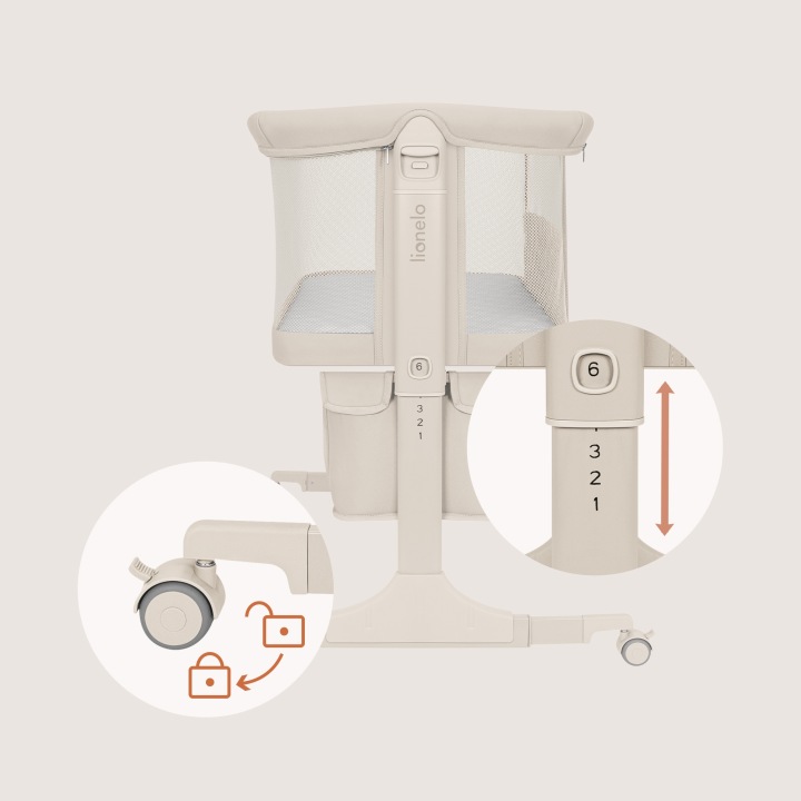 Η ρύθμιση ύψους σε 6 επίπεδα διευκολύνει την τοποθέτηση του λίκνου στο ίδιο επίπεδο με το κρεβάτι σας – ακόμη και με ψηλά κρεβάτια. Μπορείτε επίσης να το προσαρμόσετε στο ύψος σας, ώστε να τοποθετείτε και να σηκώνετε το μωρό άνετα χωρίς να επιβαρύνετε τη μέση και τη σπονδυλική σας στήλη.