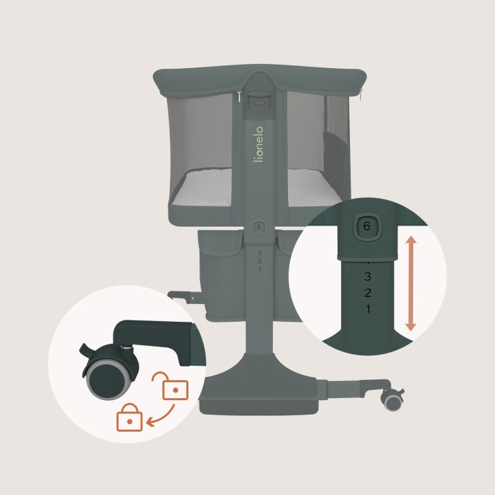 Το Lionelo Jodie λίκνο μωρού διαθέτει 6 επίπεδα ρύθμισης ύψους και ρυθμιζόμενο μήκος ποδιών, ώστε να προσαρμόζεται εύκολα σε διαφορετικά ύψη κρεβατιών, ακόμη και σε ψηλά κρεβάτια.