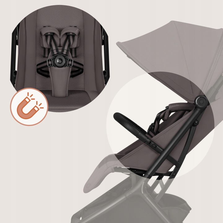 Το σύστημα ζωνών Lionelo inGrip με ανακλινόμενες τιράντες βοηθά στην εύκολη και γρήγορη τοποθέτηση του παιδιού στο καρότσι, ενώ η μαγνητική αγκράφα ζωνών κάνει το κούμπωμα πιο γρήγορο και ασφαλές.