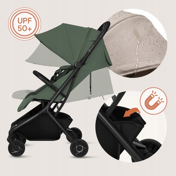 Η αδιάβροχη κουκούλα με φίλτρο UPF50+ προστατεύει το παιδί από τον ήλιο, τον αέρα και την υγρασία. Επιπλέον, το ευρύχωρο καλάθι αποθήκευσης με μαγνητικό άνοιγμα (έως 3 kg) επιτρέπει την εύκολη μεταφορά αντικειμένων και αγορών.