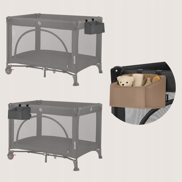 Ο Sidepocket είναι ιδανικά προσαρμοσμένος για τα παρκοκρέβατα, τα λίκνα συγκοίμησης και τα πάρκα παιχνιδιού της Lionelo.