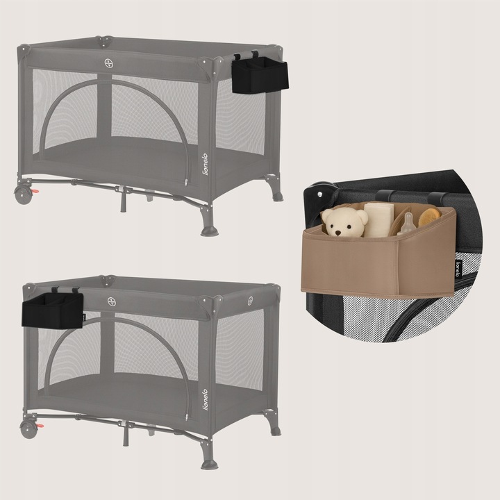 Ο Sidepocket είναι ιδανικά προσαρμοσμένος για τα παρκοκρέβατα, τα λίκνα συγκοίμησης και τα πάρκα παιχνιδιού της Lionelo.