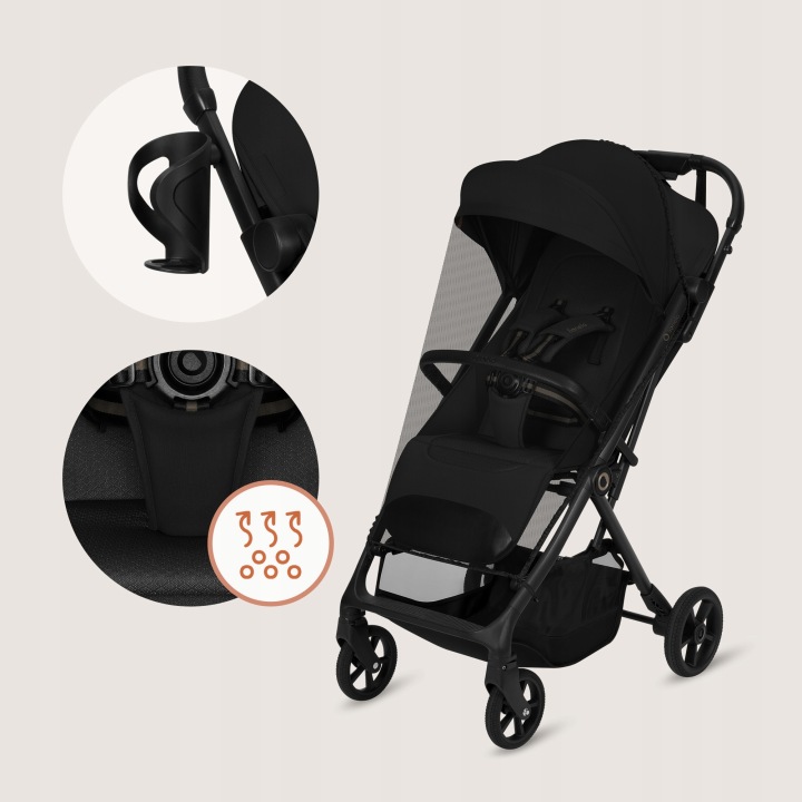 Το καρότσι διαθέτει ένα πρακτικό σετ αξεσουάρ που διευκολύνει τις καθημερινές βόλτες. Η κουνουπιέρα προστατεύει αποτελεσματικά το παιδί από έντομα κατά τη διάρκεια περιπάτων στο πάρκο ή στις διακοπές, ενώ η θήκη ποτηριού επιτρέπει να έχετε το ρόφημά σας πάντα εύκολα προσβάσιμο.