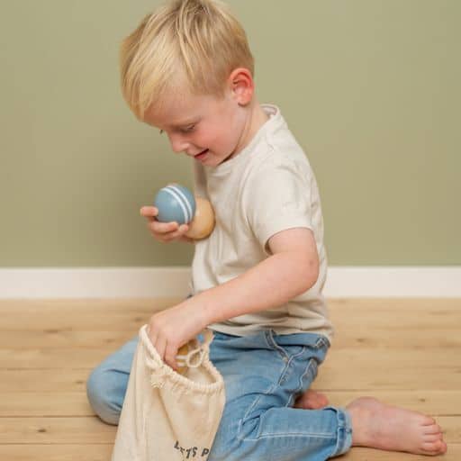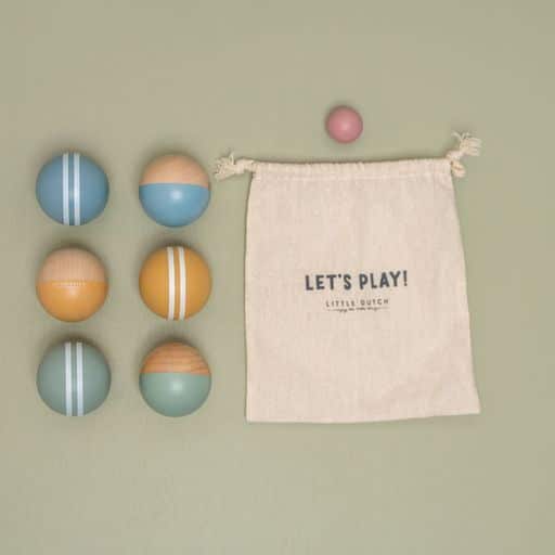 Αυτό το σετ από ξύλινες μπάλες περιλαμβάνει 6 μεγάλες μπάλες, 2 μικρές μπάλες (jack) και μια υφασμάτινη θήκη για εύκολη αποθήκευση.