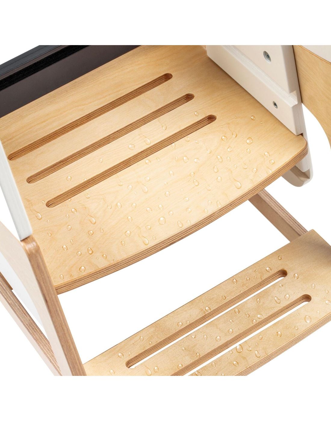 • Η εναλλαγή μεταξύ λειτουργιών είναι απλή. Μια γρήγορη περιστροφή μετατρέπει το Toucan από παιδικό πύργο εκμάθησης σε τραπέζι με καρέκλα. Μόλις το μικρό παιδί σας ξεπεράσει το στάδιο του  πύργου εκμάθησης, μπορείτε να το αποσυνδέσετε και να το μετατρέψετε σε ξύλινο σκαλοπάτι. Ο ευέλικτος σχεδιασμός 3 σε 1 του Toucan δίνει τη δυνατότητα στο παιδί σας να αντιμετωπίσει μια πληθώρα εργασιών, από το να φτάσει στους πάγκους της κουζίνας μέχρι το βούρτσισμα των δοντιών του. Για τους γονείς, η διατήρηση του Toucan καθαρού είναι εύκολη χάρη στο προστατευτικό και αδιάβροχο φινίρισμα.