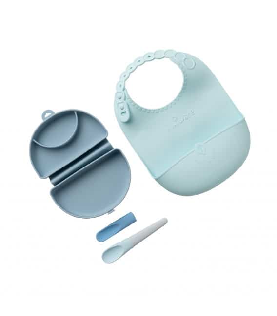 Όμορφο σετ φαγητού, αποτελούμενο από μια σαλιάρα, ένα κουτάλι κι ένα αναδιπλούμενο πιάτο, της εταιρείας Miniware, ιδανικό για το μικρό σας που μαθαίνει να τρέφεται μόνο του. Είναι εξαιρετικής ποιότητας, κατασκευασμένο από σιλικόνη, που αντέχει σε θερμοκρασίες -40°C έως +230°C και μπορεί να χρησιμοποιηθεί σε φούρνο μικροκυμάτων, πλυντήριο πιάτων και καταψύκτη.