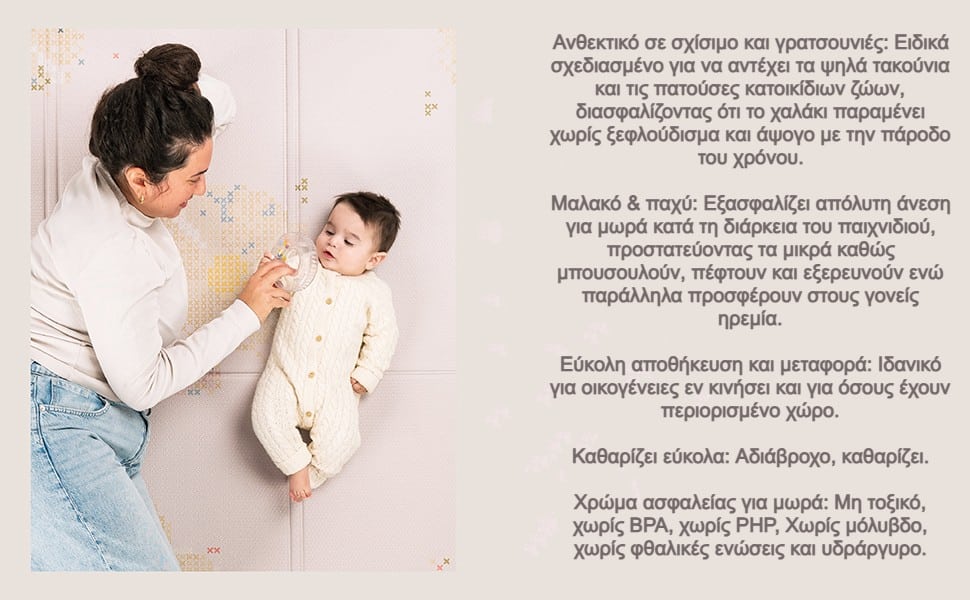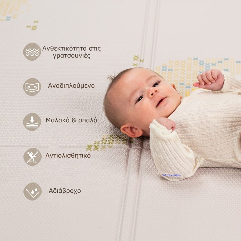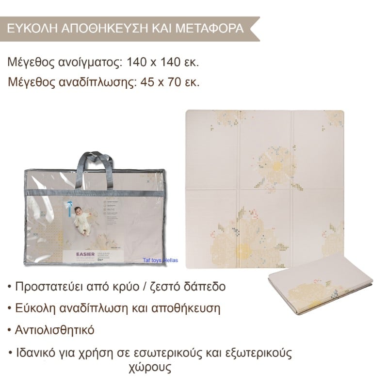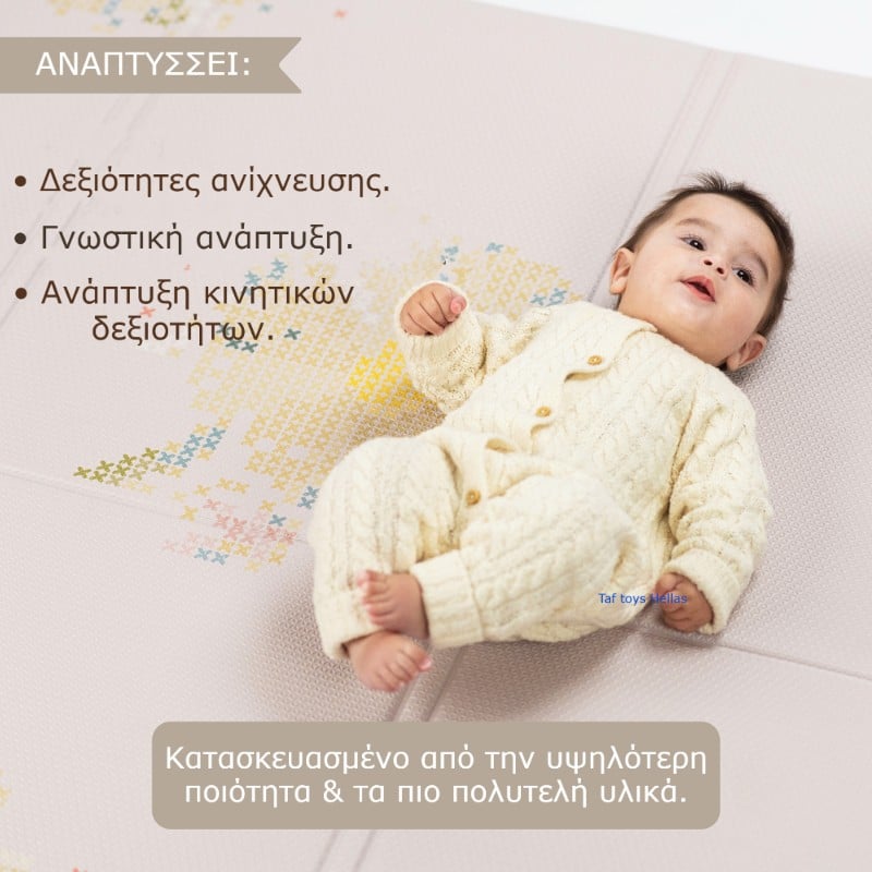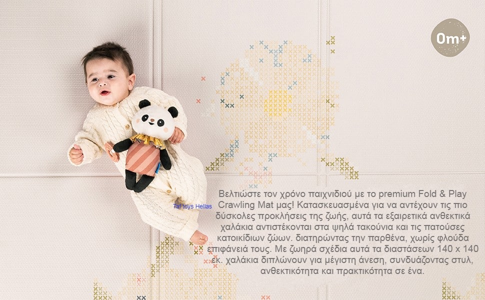 Το νέο μας χαλάκι από την συλλογή μας Fantasy Bloom της Taf toys, κατασκευάστηκε για να αντέχει στις πιο δύσκολες προκλήσεις του παιχνιδιού και τις συνεχόμενης χρήσεις του. Το εξαιρετικά ανθεκτικό χαλάκι μας αντιστέκεται στα ψηλά τακούνια και τις πατούσες κατοικίδιων ζώων, διατηρώντας την επιφάνειά του αναλλοίωτη μετά από κάθε χρήση. Κατασκευασμένο από τα πιο πολυτελή και ανθεκτικά υλικά, το χαλάκι μας παρέχει μια προστατευμένη επιφάνεια για τα μωρά από σκληρά ή κρύα δάπεδα. Εξασφαλίζει την απόλυτη άνεση για τα μωρά κατά τη διάρκεια του παιχνιδιού, προστατεύοντας καθώς μπουσουλούν, πέφτουν και εξερευνούν ενώ προσφέρει στους γονείς ηρεμία και χαρά. Τα αναστρέψιμα σχέδια και οι ζωντανές εικονογραφήσεις προωθούν την αναγνώριση μοτίβων και την εκμάθηση χρωμάτων. Οι εικονογραφήσεις εμπνέουν τη φαντασία και καλλιεργούν τη συναισθηματική ανάπτυξη μέσω του παιχνιδιού. Διπλώνει εύκολα για μέγιστη άνεση και μεταφορά, συνδυάζοντας στυλ, ανθεκτικότητα και πρακτικότητα σε ένα. Μη τοξικό, χωρίς BPA, χωρίς PHP, Χωρίς μόλυβδο, χωρίς φθαλικές ενώσεις και υδράργυρο. Στην Taf Toys καταλαβαίνουμε ότι η επιλογή του κατάλληλου αναπτυξιακού παιχνιδιού για το παιδί σας είναι μια σοβαρή απόφαση. Η μεγάλη γκάμα προϊόντων της Taf Toys σας παρέχει αναπτυξιακά παιχνίδια που αντιστοιχούν στην ηλικία του μωρού σας και που είναι προκλητικά, διασκεδαστικά και εμπνέουν τη φαντασία. Όλα τα παιχνίδια μας έχουν δημιουργηθεί με σκοπό να προωθήσουν τη συναισθηματική, γνωστική και σωματική ανάπτυξη του μωρού σας κατά τα δύο πρώτα χρόνια ανάπτυξής του. Στόχος μας είναι να βοηθήσουμε το μωρό σας να δημιουργήσει τα θεμέλια για μια υγιή και ευτυχισμένη αναπτυξιακή πορεία. Κείμενο και φωτογραφίες των προϊόντων δημοσιεύονται μόνο με την γραπτή συγκατάθεση από την Taf Toys Hellas όπου και αποτελούν πνευματική ιδιοκτησία.