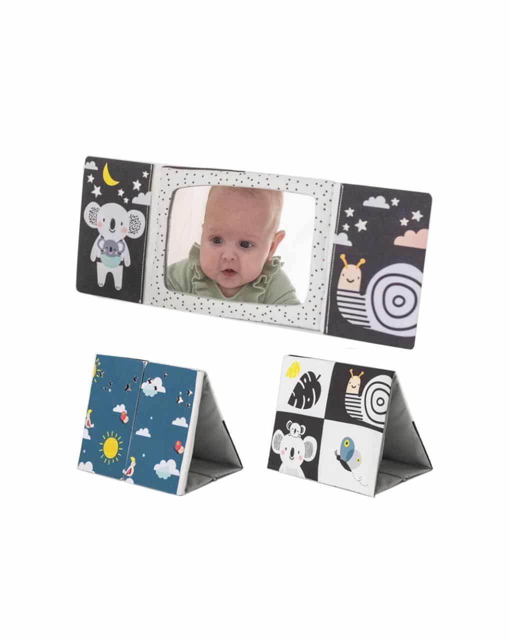 Ο μεγάλος καθρέφτης βοηθά το μωρό να μάθει την αυτογνωσία, την οπτική παρατήρηση και να αναπτύξει δεξιότητες επικοινωνίας. Τα νεογέννητα προτιμούν να κοιτάζουν πολύπλοκα μοτίβα υψηλής αντίθεσης, τα οποία βοηθούν στην ανάπτυξη της όρασης του μωρού και διεγείρουν την περιέργειά τους. Ο καθρέφτης καλύπτεται από τα πτερύγια του βιβλίου που μπορούν να χρησιμοποιηθούν για ένα υπέροχο παιχνίδι εμφάνισης -απόκρυψης μεταξύ γονέα και μωρού. Τρύπες σε σχήμα αστεριού στα πτερύγια που καλύπτουν τον καθρέφτη αστράφτουν και τραβούν την προσοχή του μωρού. Μπορεί να χρησιμοποιηθεί σε 3 διαφορετικές θέσεις: στην κοιλιά, ή σε καθιστή θέση ενώ βρίσκεστε στο καρότσι ή όταν ταξιδεύετε με αυτοκίνητο! Ελαφρύ και εύκολο στην αναδίπλωση .