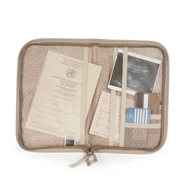 Έχει πολλαπλες πλαστικοποιημένες τσέπες κατανεμημένες και στις δύο πλευρές για καλύτερη οργάνωση των πάντων. Διαθέτει επίσης ένα πρακτικό κλείσιμο με φερμουάρ για να διατηρείτε ασφαλή το βιβλίο γέννησης και όλα τα έγγραφα του μωρού σας.